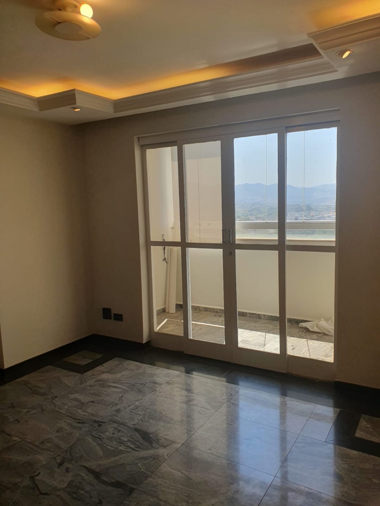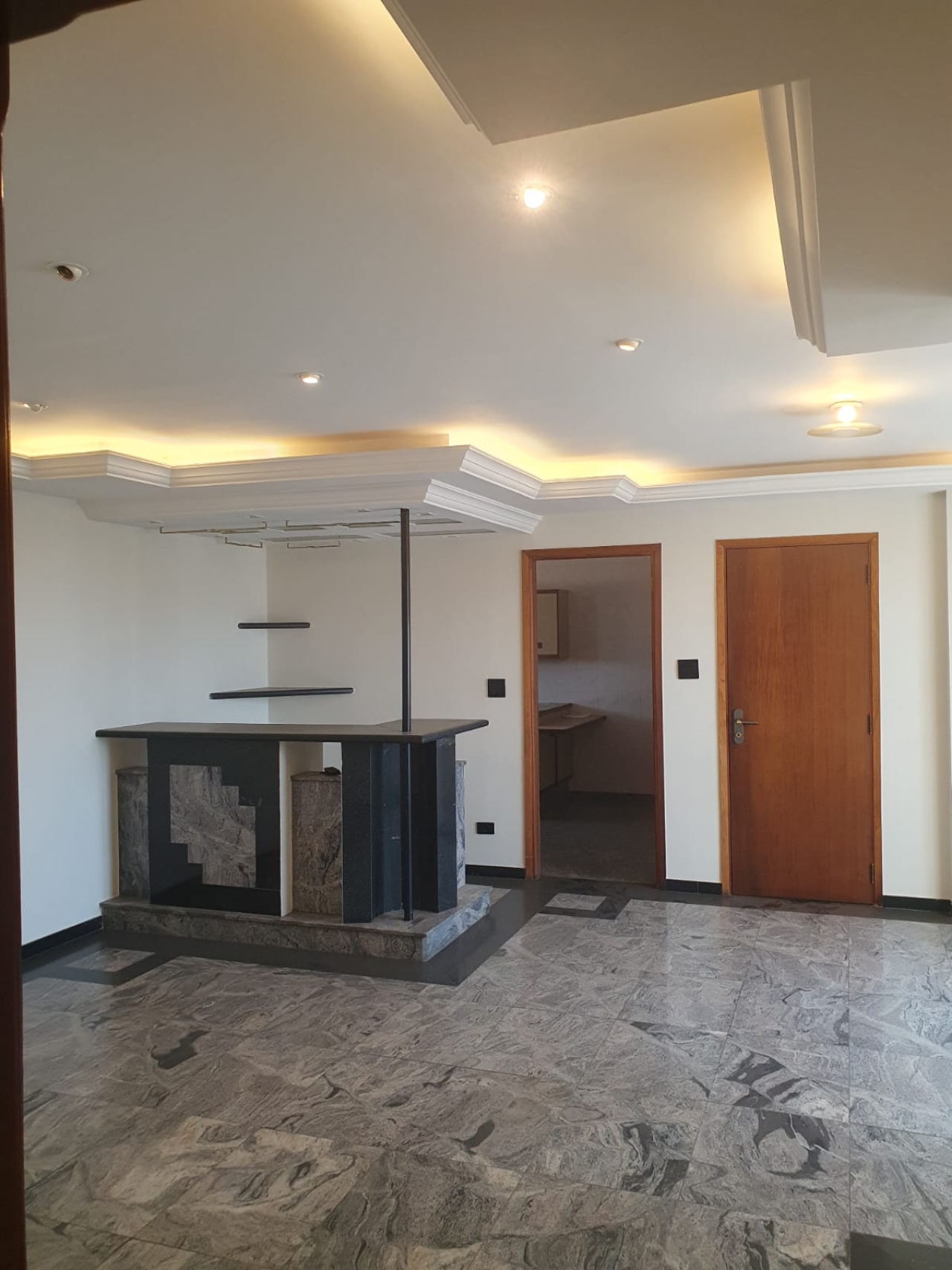 *Sala três ambientes com bar, sanca de gesso iluminada e piso em mármore;